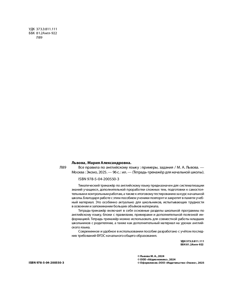 💳 Оплатить за товар можно при получении 🇰🇿 Есть бесплатная доставка по Казахстану от 1 дня 🎁 Копите бонусы с каждой покупки Серия: Тетрадь-тренажер для начальной школы (обложка) Тетрадь-тренажёр от издательства «Эксмо» гарантированно поможет ученикам начальных классов не просто выучить правила произношения слов, правописания и построения предложений в английском языке, но и научит применять их. Благодаря новой методике младшие школьники при выполнении контрольных, проверочных и домашних работ не допустят ошибок. Упражнения тренажёра способствуют систематизации и закреплению знаний, полученных на уроках английского языка, и запоминанию большого объёма материала. Разработано в соответствии с последними требованиями ФГОС начального общего образования. |