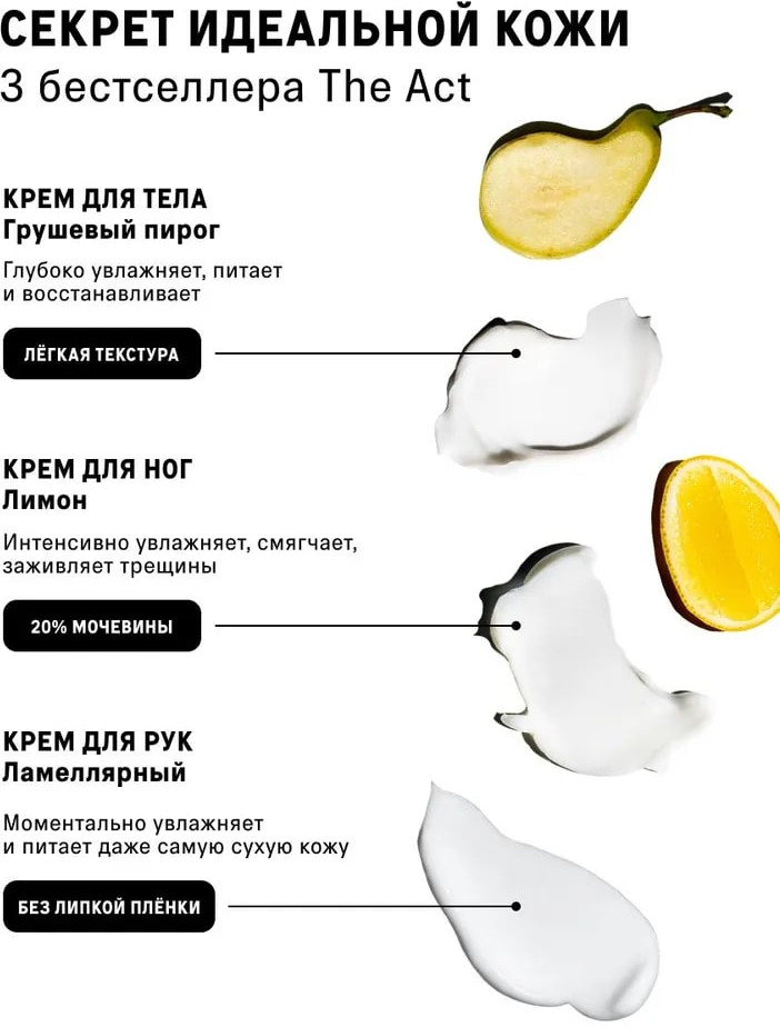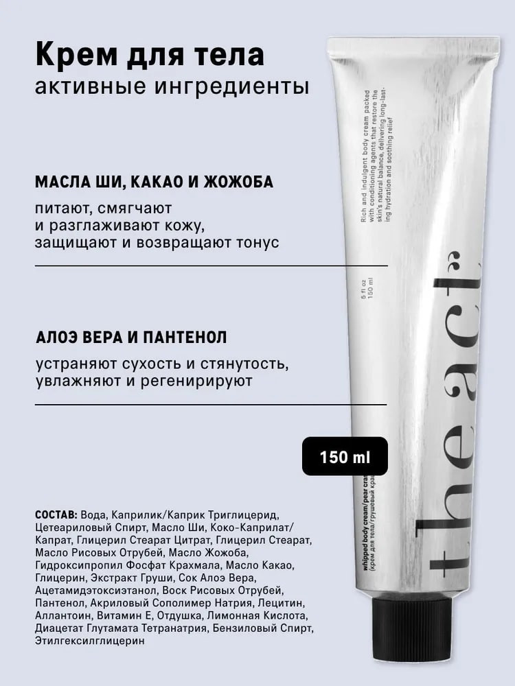 Крем для тела Грушевый пирог: Aqua (Water), Caprylic/Capric Triglyceride, Cetearyl Alcohol, Butyrospermum Parkii (Shea) Butter, Coco-Caprylate/Caprate, Glyceryl Stearate Citrate, Glyceryl Stearate, Oryza Sativa (Rice) Germ Oil, Simmondsia Chinensis (Jojoba) Seed Oil, Hydroxypropyl Starch Phosphate, Theobroma Cacao (Cocoa) Seed Butter, Glycerin, Pirus Communis (Pear) Fruit Extract, Aloe Barbadensis (Aloe Vera) Leaf Juice, Acetamidoethoxyethanol, Oryza Sativa (Rice) Wax, Panthenol, Sodium Acrylates Copolymer, Lecithin, Allantoin, Tocopheryl Acetate, Fragrance, Citric Acid, Tetrasodium Glutamate Diacetate, Benzyl Аlcohol, Ethylhexylglycerin.