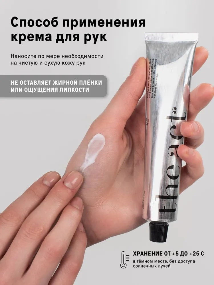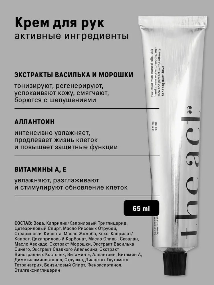 Крем для рук: Aqua (Water), Caprylic/Capric Triglyceride, Cetearyl Alcohol, Oryza Sativa (Rice) Bran Oil, Stearic Acid, Simmondsia Chinensis (Jojoba) Seed Oil, Coco-Caprylate/Caprate, Dicaprylyl Carbonate, Olea Europaea (Olive) Oil Unsaponifiables, Olea Europaea (Olive) Oil, Squalane, Persea Gratissima (Avocado) Fruit Extract, Rubus Chamaemorus (Cloudberry) Fruit Extract, Centaurea Cyanus (Cornflower) Flower Extract, Citrus Sinensis (Orange) Peel Extract, Vitis Vinifera (Grape) Seed Extract, Tocopherol, Allantoin, Retinyl Palmitate, Retinyl Acetate, Тocopheryl Acetate, Dimethylaminoethanol, Triglycerides Linoleic and Linolenic Acids, Fragrance, Tetrasodium Glutamate Diacetate, Benzyl Alcohol, Phenoxyethanol, Ethylhexylglycerin.
