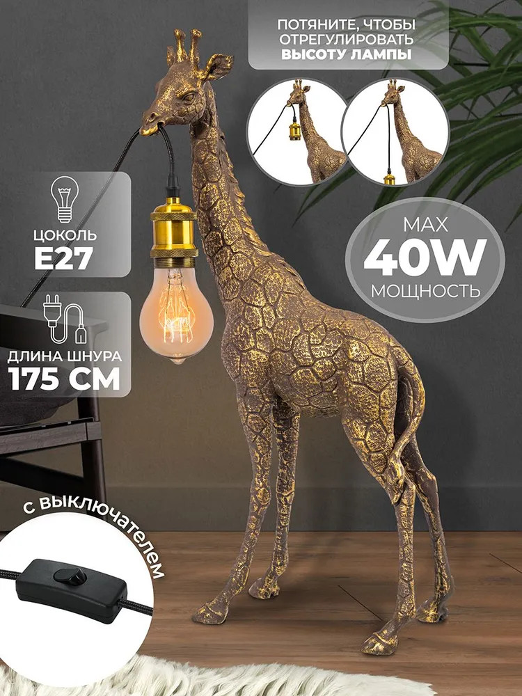 💳 Оплатить за товар можно при получении 🇰🇿 Есть бесплатная доставка по Казахстану от 1 дня 🎁 Копите бонусы с каждой покупки Светильник Жираф от Elan Gallery — это не только дополнительный источник света, но и стильное украшение интерьера спальни или гостиной. Фигурную лампу в виде изящного животного можно использовать как настольную или напольную. Рекомендуется использовать лампочку мощностью не более 40 W (в комплект не входит). Работает от сети, необходимо наличие розетки. Длина провода 175 см. Положение лампочки регулируется: потяните за шнур, чтобы зафиксировать её на нужной высоте. |