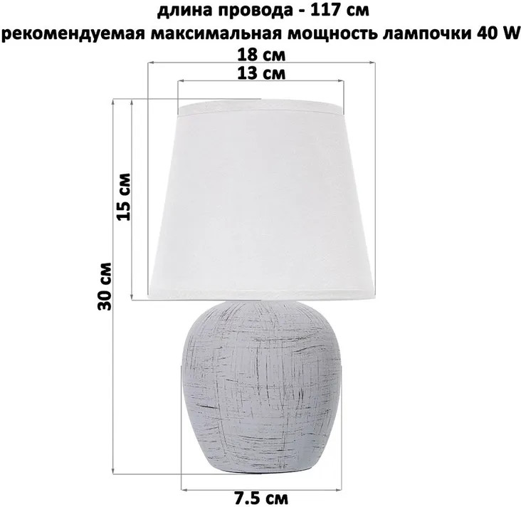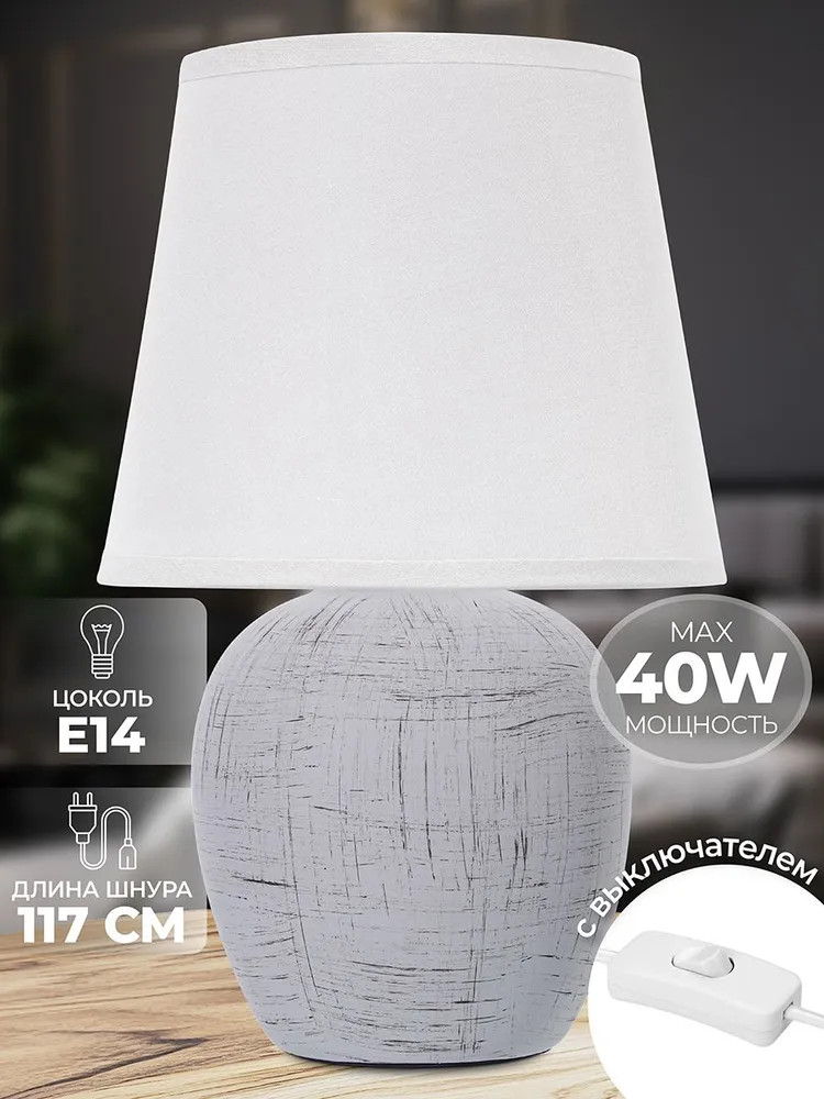 Elan Gallery Лампа настольнаяВ данный момент этот товар отсутствует в продаже. Возможно, у нас найдется аналогичный или похожий товар здесь. Настольная лампа со светло-серым абажуром от Elan Gallery — это не только дополнительный источник света, но и стильное украшение интерьера спальни или гостиной. Фигурное основание серого цвета выполнено из керамики. Его поверхность украшена рисунком, имитирующим эффект потёртости. Диаметр нижней части подставки 7,5 см. Размеры абажура: диаметр по верху 13 см, диаметр по низу 18 см, высота 15 см. Рекомендуется использовать лампочку мощностью не более 40 W (в комплект не входит). Работает от сети, необходимо наличие розетки. Длина провода 117 см. Имеет стильный дизайн и компактный размер. Маленькая лампа добавит элегантности вашему интерьеру! Декоративный светильник поможет создать уютную атмосферу в комнате или на кухне. Он подходит для использования в качестве ночника, а также прикроватного светильника. Станет отличным предметом декора для вашего комода или журнального столика. Прекрасно впишется в интерьер детской комнаты, создавая уютную атмосферу для школьника. Можно поставить на туалетный столик возле кровати для спокойного чтения книг перед сном. На даче небольшой ночной светильник поможет создать приятную атмосферу на террасе или в доме. Поставьте красивую лампу на стол или тумбочку, чтобы организовать дополнительную подсветку в любом пространстве. Фигурная настольная лампа станет приятным подарком на любой праздник как взрослым, так и детям. |