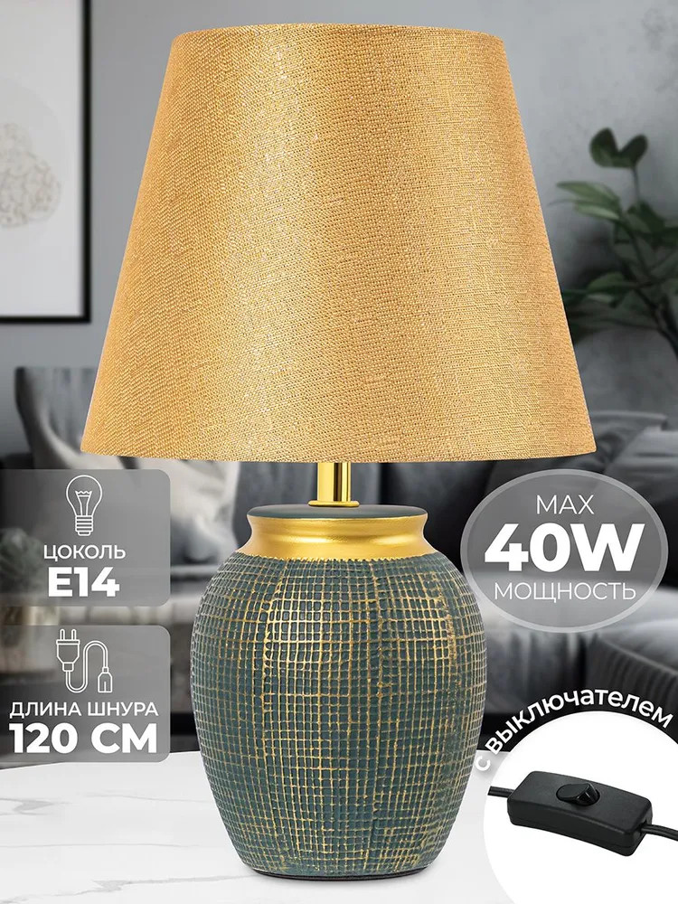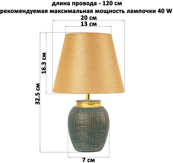 Elan Gallery Лампа настольнаяВ данный момент этот товар отсутствует в продаже. Возможно, у нас найдется аналогичный или похожий товар здесь. Настольная лампа с золотистым абажуром от Elan Gallery — это не только дополнительный источник света, но и стильное украшение интерьера спальни или гостиной. Абажур украшен мелкими блёстками. Фигурное основание зелёного цвета выполнено из керамики. Оно украшено золотым узором с эффектом состаривания. Диаметр нижней части подставки 7 см. Размеры абажура: диаметр по верху 13 см, диаметр по низу 20 см, высота 16,3 см. Рекомендуется использовать лампочку мощностью не более 40 W (в комплект не входит). Работает от сети, необходимо наличие розетки. Длина провода 120 см. Имеет стильный дизайн и компактный размер. Маленький декоративный светильник поможет создать уютную атмосферу в комнате или на кухне. Он подходит для использования в качестве ночника, а также прикроватного светильника. Станет отличным предметом декора для вашего комода или журнального столика. Прекрасно впишется в интерьер детской комнаты, создавая уютную атмосферу для школьника. Можно поставить на туалетный столик возле кровати для спокойного чтения книг перед сном. На даче небольшой ночной светильник поможет создать приятную атмосферу на террасе или в доме. Поставьте красивую лампу на стол или тумбочку, чтобы организовать дополнительную подсветку в любом пространстве. Фигурная настольная лампа станет приятным подарком на любой праздник как взрослым, так и детям. |