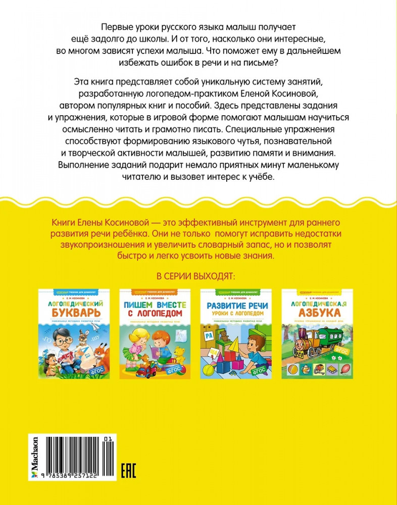 💳 Оплатить за товар можно при получении 🇰🇿 Есть бесплатная доставка по Казахстану от 1 дня 🎁 Копите бонусы с каждой покупки Серия: Отличный учебник для дошколят Первые уроки русского языка малыш получает ещё задолго до школы. И от того, насколько они интересные, во многом зависят успехи малыша. Что поможет ему в дальнейшем избежать ошибок в речи и на письме? Эта книга представляет собой уникальную систему занятий, разработанную логопедом-практиком Еленой Косиновой, автором популярных книг и пособий. Здесь представлены задания и упражнения, которые в игровой форме помогают малышам научиться осмысленно читать и грамотно писать. Специальные упражнения способствуют формированию языкового чутья, познавательной и творческой активности малышей, развитию памяти и внимания. Выполнение заданий доставит немало приятных минут маленькому читателю и вызовет интерес к учёбе. |