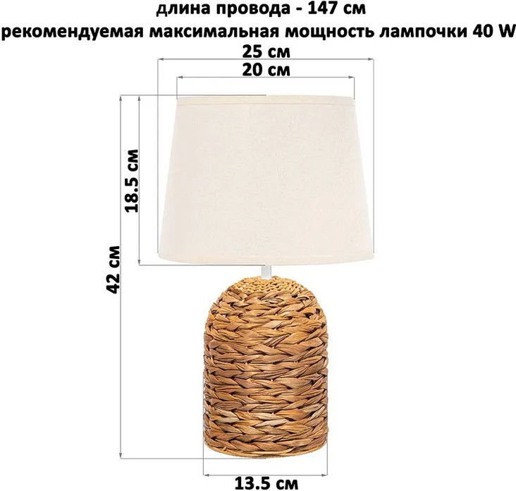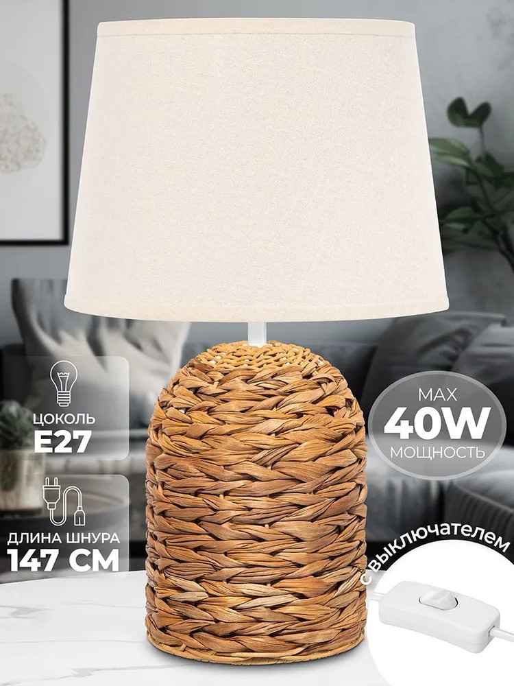 Elan Gallery Лампа настольная «Плетенка»В данный момент этот товар отсутствует в продаже. Возможно, у нас найдется аналогичный или похожий товар здесь. Настольная лампа с бежевым абажуром от Elan Gallery — это не только дополнительный источник света, но и стильное украшение интерьера спальни или гостиной. Основание выполнено из высушенных стеблей и листьев водного гиацинта. Этот материал не выгорает на солнце, прочен и экологичен. Диаметр нижней части подставки 13,5 см. Размеры абажура: диаметр по верху 20 см, диаметр по низу 25 см, высота 18,5 см. Рекомендуется использовать лампочку мощностью не более 40 W (в комплект не входит). Работает от сети, необходимо наличие розетки. Длина провода 147 см. Имеет стильный дизайн: плетёное основание из природного материала добавит гармонии природы домашнему пространству! Декоративный светильник поможет создать уютную атмосферу в комнате или на кухне. Он подходит для использования в качестве ночника, а также прикроватного светильника. Станет отличным предметом декора для вашего комода или журнального столика. Лампа прекрасно впишется в интерьер детской комнаты, создавая уютную атмосферу для школьника. Можно поставить на туалетный столик возле кровати для спокойного чтения книг перед сном. На даче ночной светильник поможет создать приятную атмосферу на террасе или в доме. Поставьте красивую лампу на стол или тумбочку, чтобы создать дополнительную подсветку в любом пространстве. Фигурная настольная лампа станет приятным подарком на любой праздник как взрослым, так и детям. |