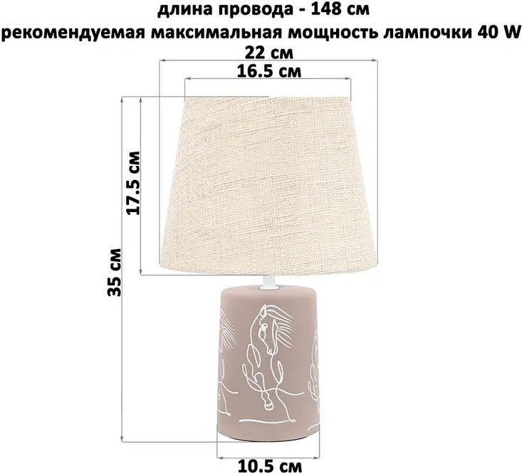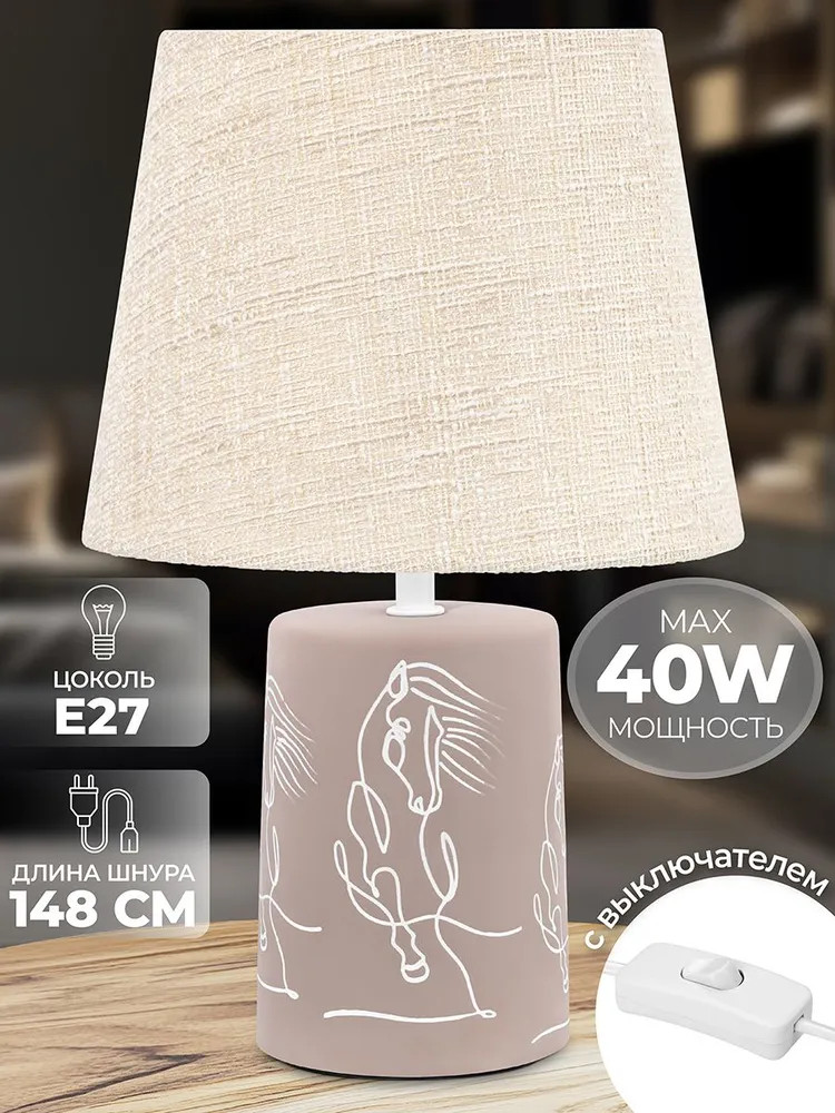 Elan Gallery Лампа настольнаяВ данный момент этот товар отсутствует в продаже. Возможно, у нас найдется аналогичный или похожий товар здесь. Настольная лампа с бежевым абажуром от Elan Gallery — это не только дополнительный источник света, но и стильное украшение интерьера спальни или гостиной. Основание цвета кофе с молоком выполнено из керамики и украшено рельефными изображениями лошадей. Диаметр нижней части подставки 10,5 см. Размеры абажура: диаметр по верху 16,5 см, диаметр по низу 22 см, высота 17,5 см. Рекомендуется использовать лампочку мощностью не более 40 W (в комплект не входит). Работает от сети, необходимо наличие розетки. Длина провода 148 см. Благодаря стильному дизайну добавит элегантности вашему интерьеру! Декоративный светильник поможет создать уютную атмосферу в комнате или на кухне. Он подходит для использования в качестве ночника, а также прикроватного светильника. Станет отличным предметом декора для вашего комода или журнального столика. Прекрасно впишется в интерьер детской комнаты, создавая уютную атмосферу для школьника. Можно поставить на туалетный столик возле кровати для спокойного чтения книг перед сном. На даче небольшой ночной светильник поможет создать приятную атмосферу на террасе или в доме. Поставьте красивую лампу на стол или тумбочку, чтобы организовать дополнительную подсветку в любом пространстве. Фигурная настольная лампа станет приятным подарком на любой праздник как взрослым, так и детям. |