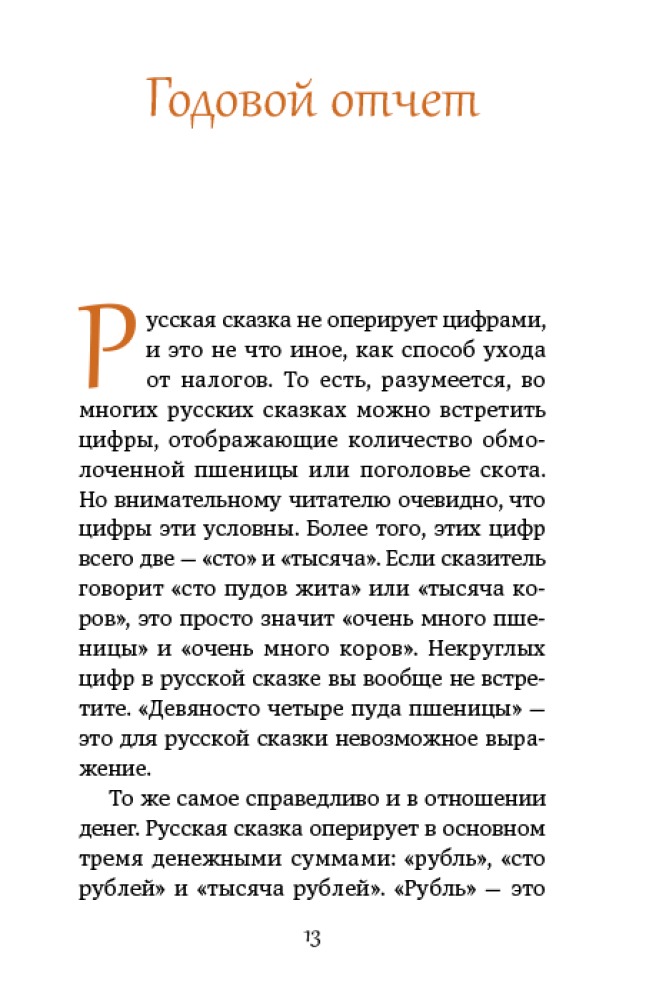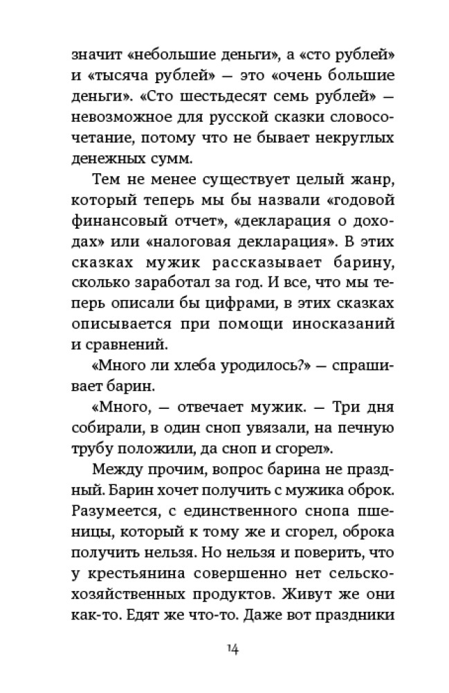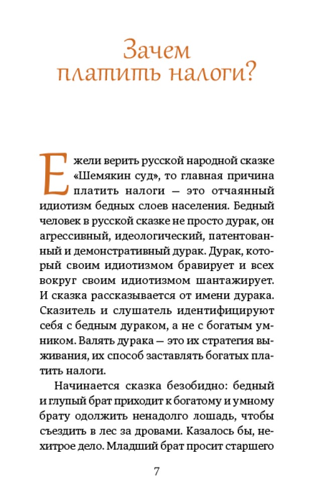 Русские налоговые сказкиВ данный момент этот товар отсутствует в продаже. Возможно, у нас найдется аналогичный или похожий товар здесь. Налоги придуманы не просто так и их нужно платить, — большинство людей на земле признают это. Но мало кто понимает, как именно налоги устроены. Тем более — народ. Однако представление о запутанной системе налогообложения можно составить, проанализировав корпус русских народных сказок. Налогов там множество: они часто малообъяснимы, ставки их произвольны, а собирают их все, кому не лень. Совершенно очевидно, что уплатить все подати просто невозможно. Однако ухитряются же как-то сказочные персонажи хозяйствовать и не пойти по миру. Как им это удается? |