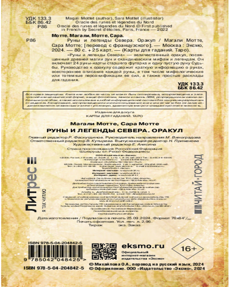 💳 Оплатить за товар можно при получении 🇰🇿 Есть бесплатная доставка по Казахстану от 1 дня 🎁 Копите бонусы с каждой покупки Серия: Карты для гаданий. Таро «Руны и легенды Севера» Магали и Сары Мотте — величественный Оракул, посвященный древней магии рун и скандинавским мифам и легендам. Руны — таинственные древние письмена — нашептывают нам о легендах и мифах Севера, суровых скандинавских богах и легендарных сражениях. Они рассказывают нам о магии и древнем Знании, затерянных и забытых путях к мудрости. Задайте рунам вопрос — и прислушайтесь к ответу. |