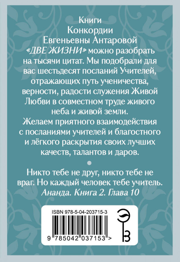 Серия: Карты мудрости для духовных практик. Оракулы и МАК Книги Конкордии Антаровой «Две жизни» можно разобрать на тысячи цитат. В этой подарочной колоде мы собрали 60 цитат, отражающих главные мысли-послания легендарного романа. Это Послания Учителей, собранные в форме оракула, с которыми можно взаимодействовать, отркывая для себя новые истины и смыслы. Впервые у читатей появляется уникальная возжможность представить героев произведения и окунуться в глубины философской мудрости романа, ставшего духовным ориентиром для многих поколений читатателей. Желаем вам приятного и полезного взаимодействия с посланиями учителей и раскрытия своих лучших качеств, талантов и даров. |