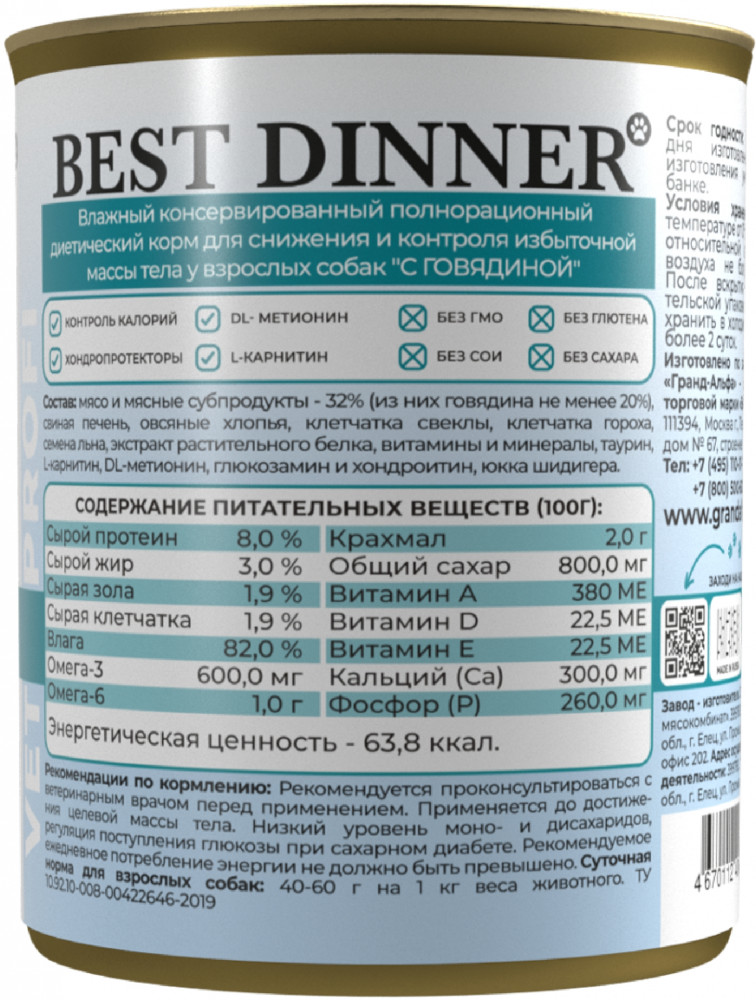 Best Dinner Корм для снижения и контроля избыточной массы тела взрослых собак с говядиной «Obesity»