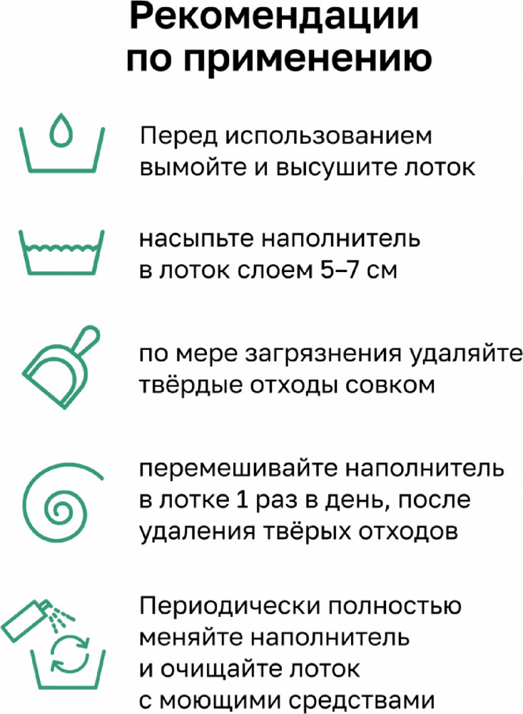 Способ применения: перед использованием вымойте и высушите лоток. Насыпьте наполнитель в лоток слоем 5-7 см. По мере загрязнение удаляйте твердые отходы совком. Перемешивайте наполнитель в лотке 1 раз в день. Периодически полностью меняйте наполнитель и очищайте лоток с моющими средствами. Добавляйте наполнитель по мере необходимости.