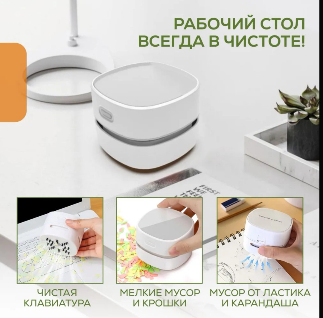 В данный момент этот товар отсутствует в продаже. Возможно, у нас найдется аналогичный или похожий товар здесь. Настольный мини-пылесос — отличный выбор для тех, кто хочет поддерживать чистоту в своём доме, офисе, приучить ребенка к чистоте без лишних хлопот и затрат. Пылесос послужит хорошим помощником мастеру для маникюра, ребенку, для поддержания рабочего стола в чистоте, офисному работнику и хозяйке на кухне. Он компактный, лёгкий и удобный в использовании, поэтому его можно применять для уборки самых разных поверхностей. В мини пылесос встроено беспроводное зарядное устройство для телефона.