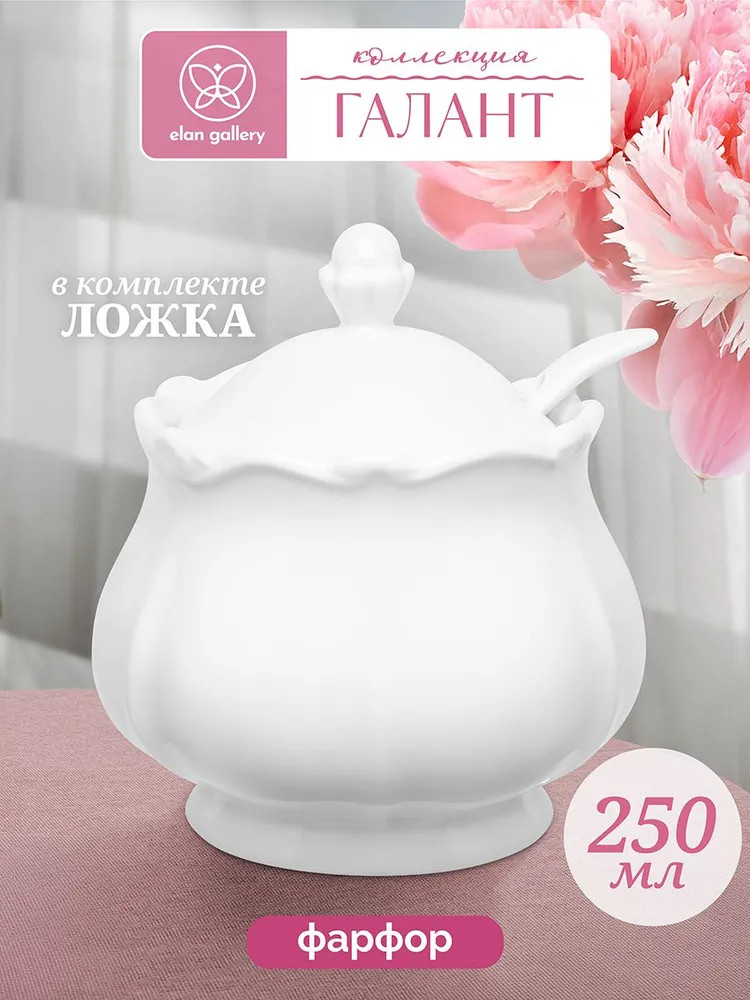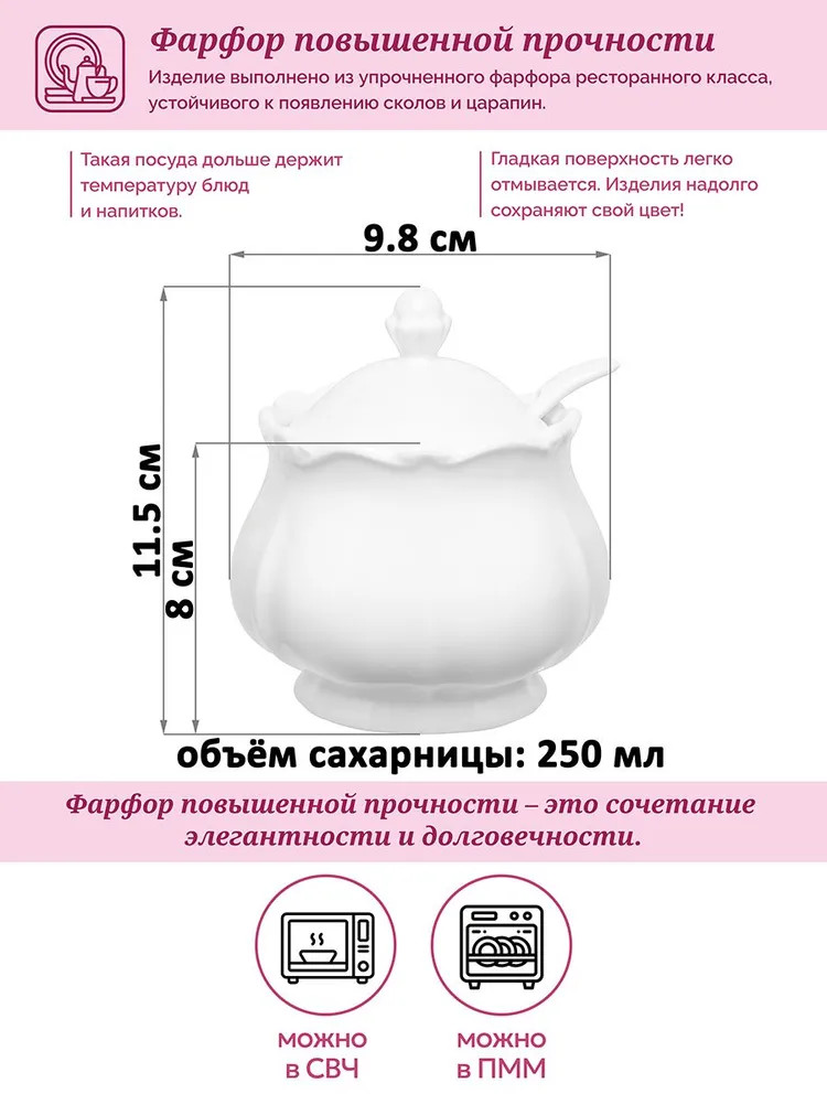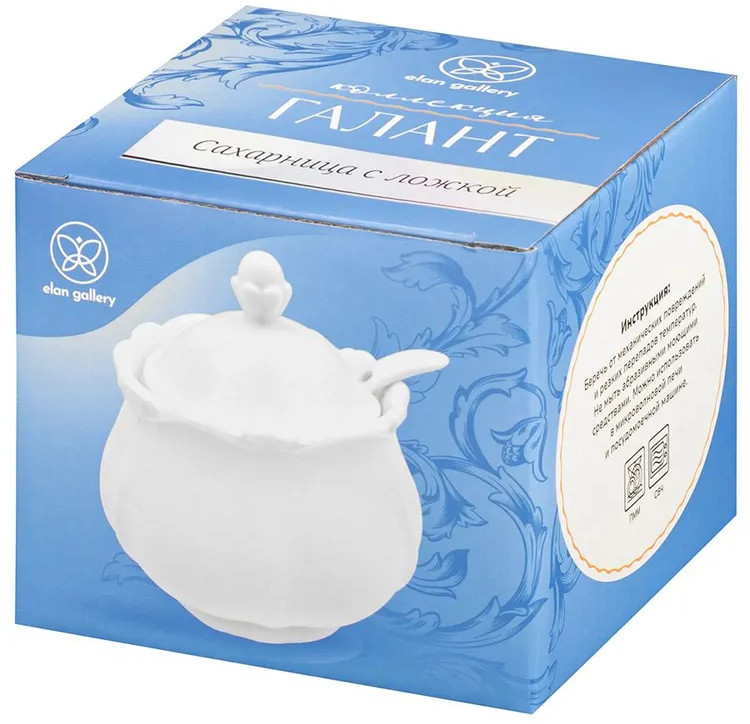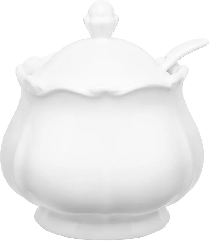 Сахарница с ложечкой из серии «Галант» предназначена для хранения разнообразных продуктов. Выполнены из высококачественного белого фарфора. Сахарница цветочной формы украшена рельефом и ажурной каймой, её крышечка увенчана фигурной ручкой. Фарфор не впитывает цвет продуктов и надолго сохранит свою нежную белизну. Изделие дополнит интерьер и привнесёт в вас дом атмосферу французской утончённости. Ёмкость подойдёт для сахара, варенья, мёда и даже икры. Используйте её для специй и приправ, чтобы во время приготовления пищи всё необходимое было под рукой. Изогнутая ложечка поможет вам набрать необходимое количество продукта и аккуратно помещается в баночке благодаря выемке на крышке.