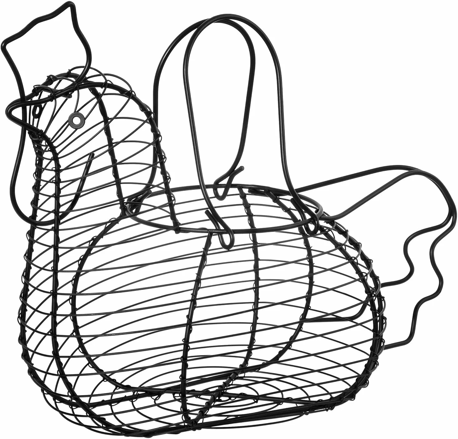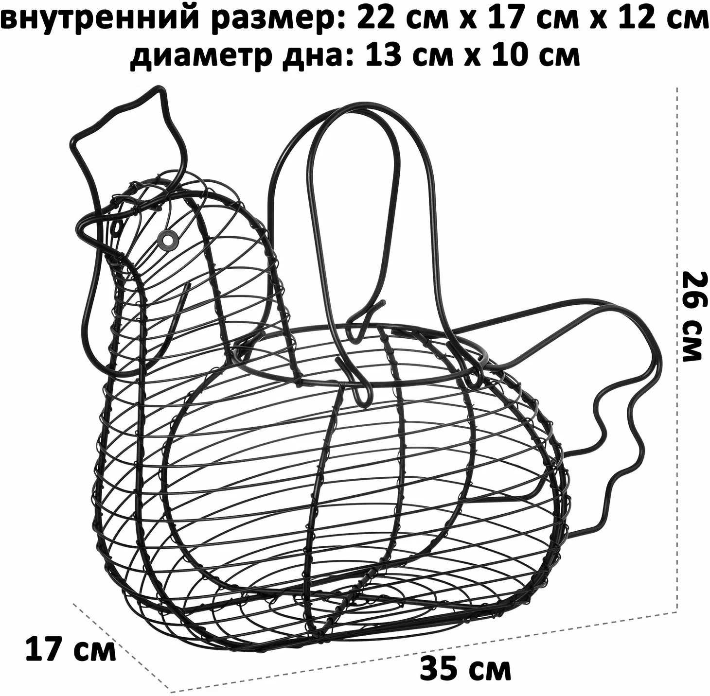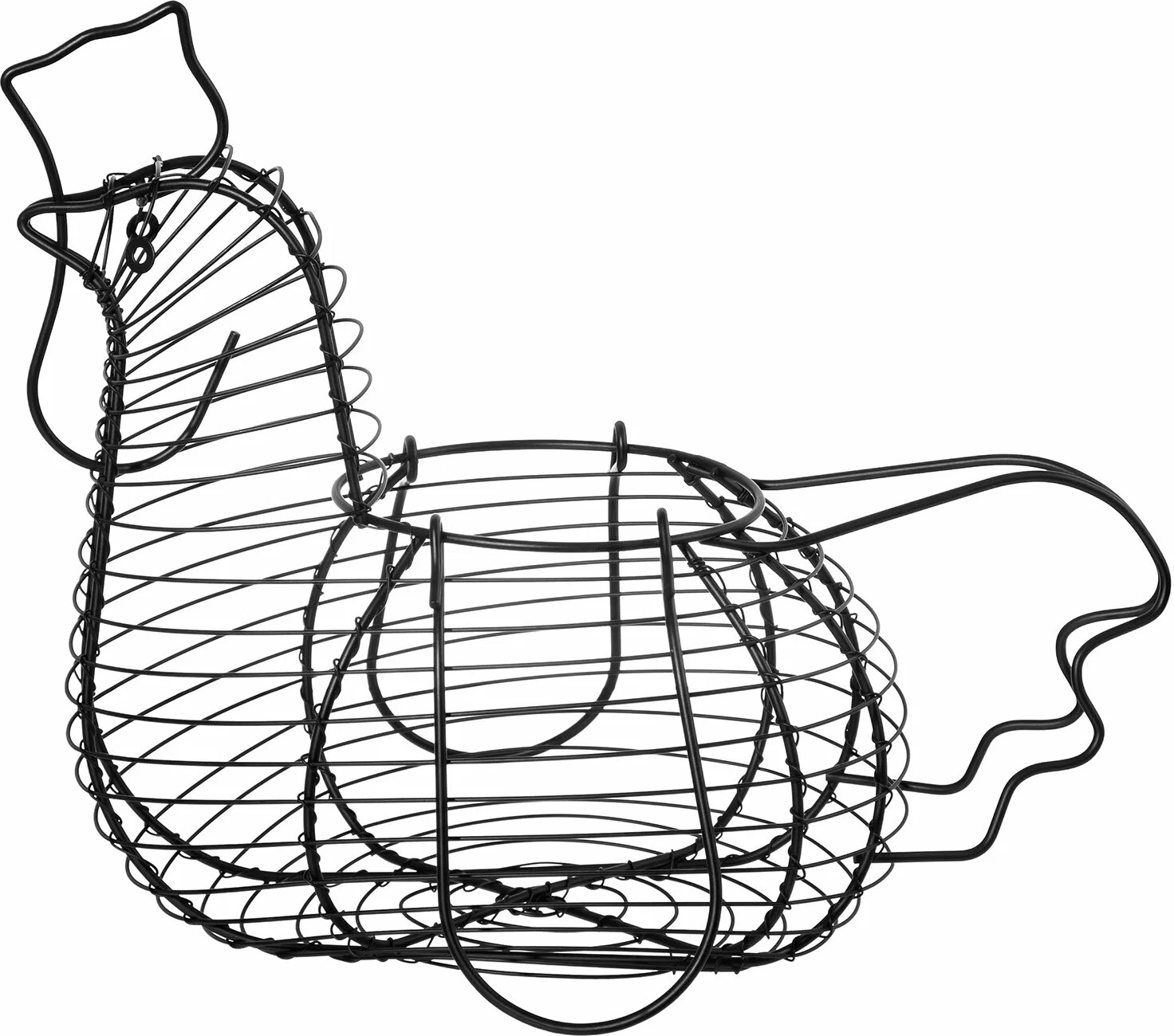Корзина для яиц предназначена для организации хранения продуктов на вашей кухне. Чёрная плетёная корзинка в виде курочки выполнена из металла. Она послужит стильной альтернативой традиционным лоткам для яиц.
