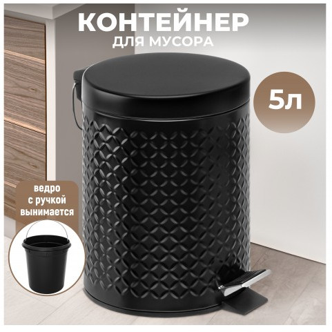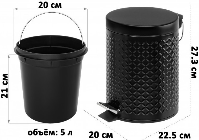 Контейнер для мусора предназначен для организации порядка в вашем доме.Ёмкость чёрного цвета выполнена из металла, имеет внутри пластиковое ведро. Урна оснащена герметичной крышкой — она не пропустит запахов и не допустит выпадения мусора. Крышка открывается педальным механизмом. Педаль легко нажать — вам не потребуется прикладывать усилий. Внутреннее и внешнее ведро оснащены металлическими ручками, благодаря чему каждый элемент будет удобен для переноски. Маленькая компактная мусорка отлично послужит вам для уборки и наведения порядка — её легко взять с собой в нужную комнату. Подойдёт для уборки стола и полок, перебирания канцелярии и бумаг. Напольная урна найдёт своё место в любой части вашего дома. Поставьте её под рабочим столом или на кухне под раковиной, чтобы выбрасывать в неё кожуру, остатки еды или бумажные полотенца. Разместите в туалете и ванной комнате для утилизации гигиенических и косметических принадлежностей. Станет прекрасным помощником для любителей рукоделия — можно держать под рукой и с удобством избавляться от излишков материала. Подойдёт для размещения возле офисного стола. Аккуратный контейнер с неброским рельефным узором будет стильным дополнением любого интерьера. Не рекомендуется применять абразивные моющие средства. Компактная мусорная урна станет практичным дополнением вашего дома, офиса и дачи.