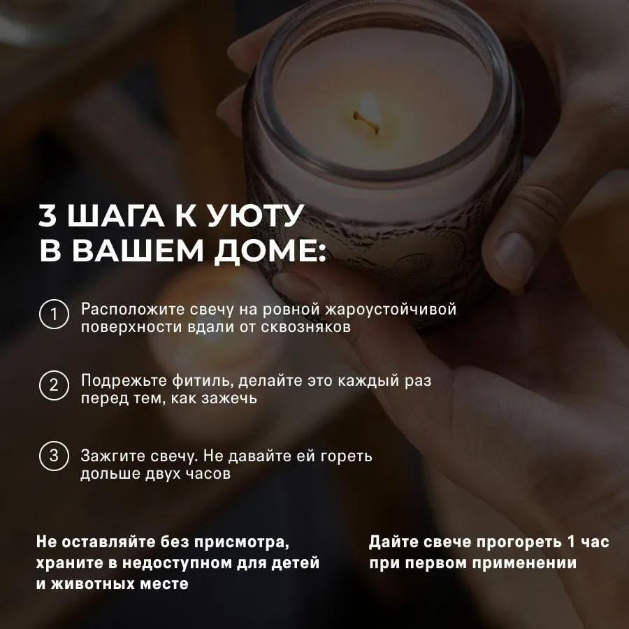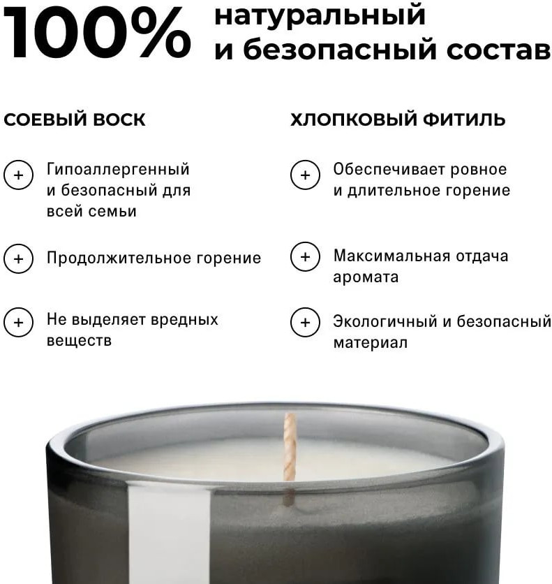 Свеча выполнена из безопасных материалов — 100% соевого воска и фитиля из натурального хлопка. Они обеспечивают чистое, мягкое горение до 45 часов и создают ровное пламя, не выделяя вредных веществ. Начните день, наполнив его особенными моментами: зажгите свечу во время завтрака, утреннего ухода или зарядки. А вечером проведите время в ванной, создав камерную атмосферу спа.