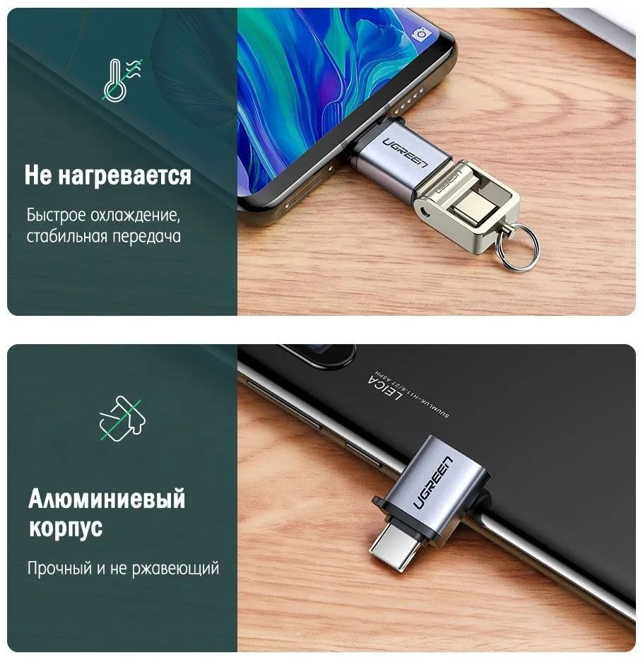 Надо на флешку с телефона скинуть фотки? Или надо подключить мышку, жесткий диск, кардридер или клавиатуру к телефону? Не вопрос! Этот адаптер решит эти проблемы. Как всегда отличное качество и компактность от UGREEN. 100% совместимость со всеми выходами Туре-С, Macbook, Xiaomi4C, Meizu Pro5, Google Nexus 6P/5X, Microsoft Lumia 950/XL возможность смотреть фильмы, читать книги и сохранять фото на флешке.