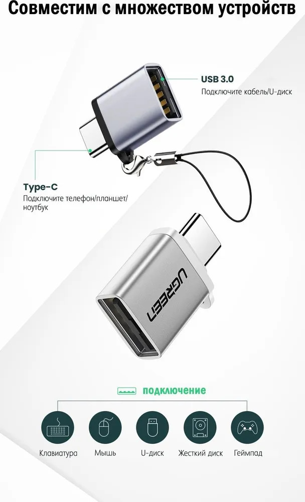 Компактный адаптер-переходник USB 3.0 — USB Type-C от компании Ugreen. Позволит подключить устройства и кабели с разъемом USB 3.0 к устройству с разъемом Type-C. Миниатюрный размер позволит носить адаптер с собой.