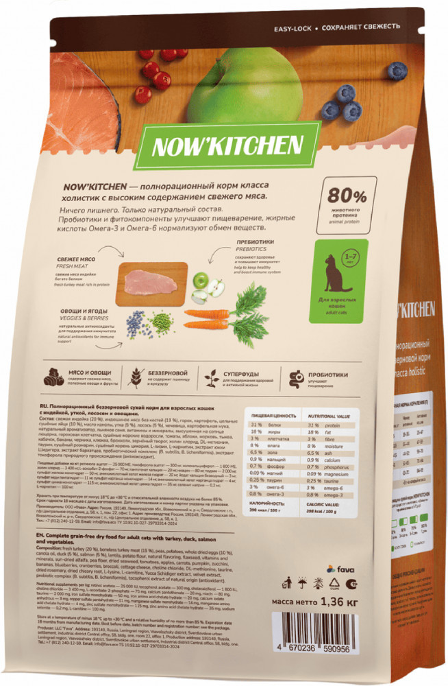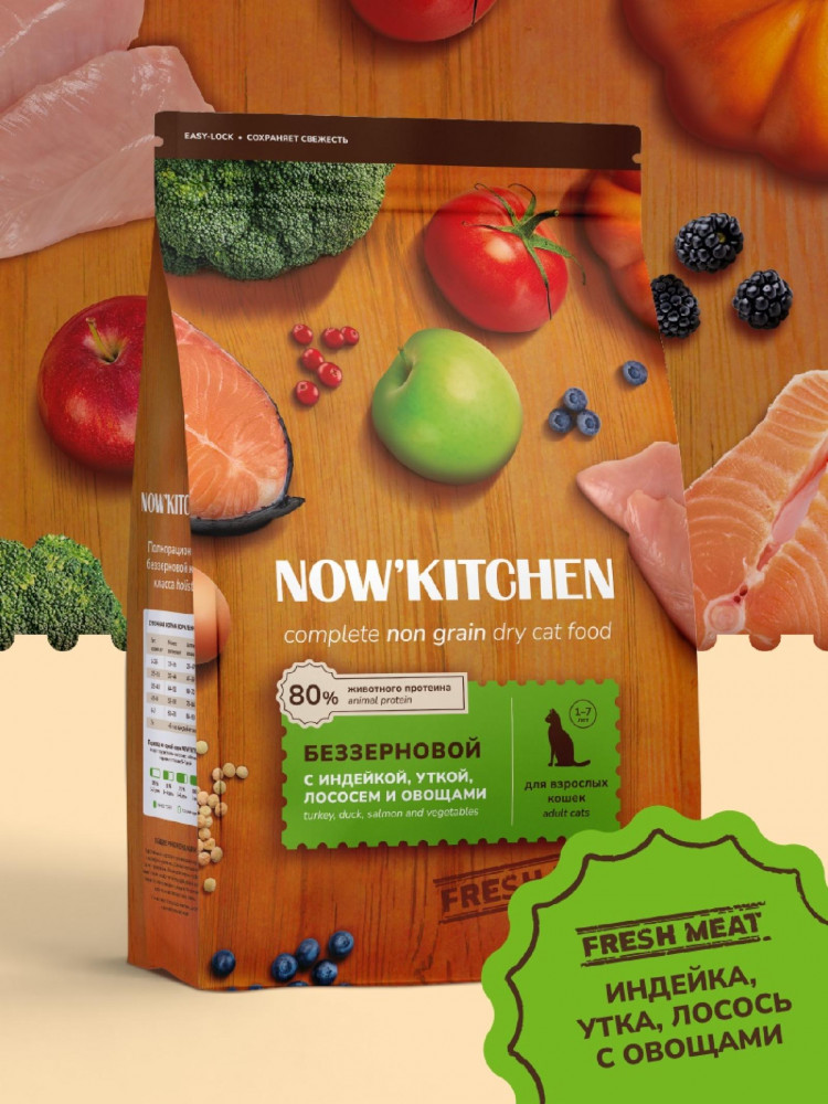 Now'Kitchen Корм беззерновой для взрослых кошек со свежей индейкой, уткой, лососем и овощами «Adult Grain-free Recipe, Turkey, Duck, Salmon»