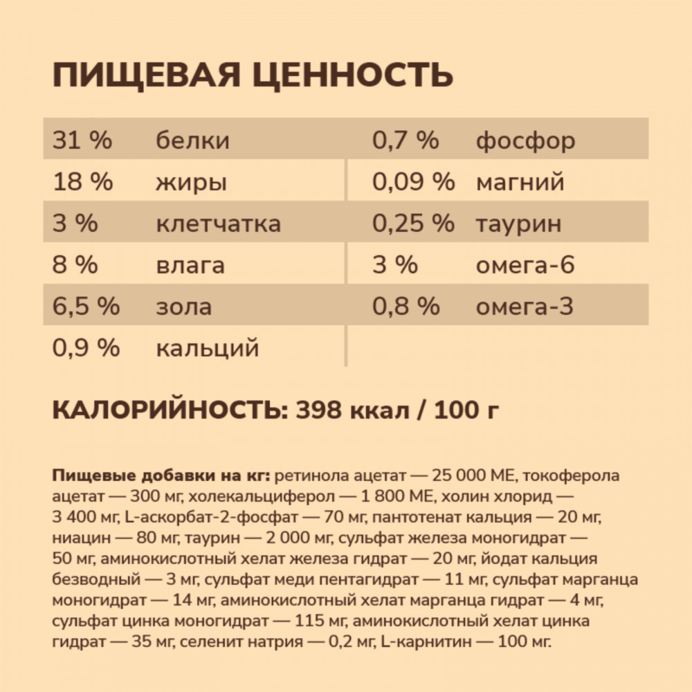 размер гранул очень маленький. Больше подойдёт для котят, на упаковке написано 80% животного протеина, а по факту 59% всего, включая рыбу. И слишком много овощей. Это большой минус.