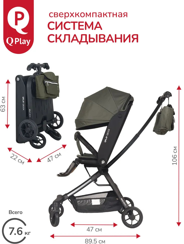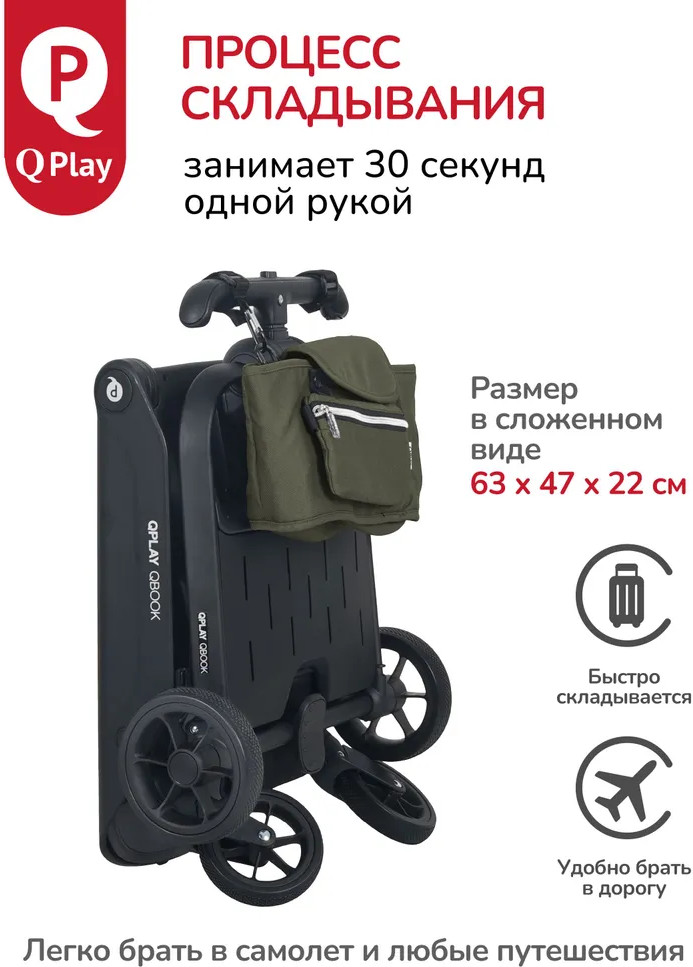 Детская складная коляска премиум-класса «Qbook» 360° от всемирно известной немецкой ТМ Qplay сочетает современный дизайн, многофункциональность и повышенный комфорт во время использования. Коляска произведена по стандартам EN1888-1 из современных материалов, что гарантирует высокую надёжность и полную безопасность для ребёнка. Благодаря поворотному сиденью, малыш может совершать прогулку не только глядя вперёд, но и лицом к родителю. Многопозиционная откидывающаяся спинка обеспечивает детям максимальный комфорт. Диапазон регулировки спинки 50° до положения «сон» (угол наклона 160°). Коляска «Qbook» с компактной складной рамой после складывания превращается в чемодан, что очень удобно для хранения и транспортировки. Ее можно поместить в багажник и отправиться с ребёнком в торговый центр и на прогулку или взять с собой в самолёт. Размер в сложенном виде всего 63×47×22 см.
