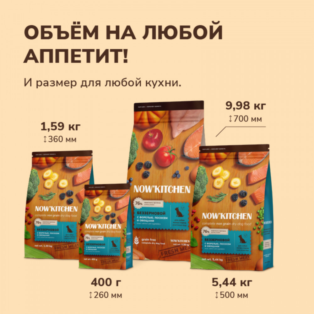 Now'Kitchen Корм беззерновой для взрослых собак малых пород со свежей форелью, лососем «Small Adult Grain-free Recipe, Trout, Salmon»