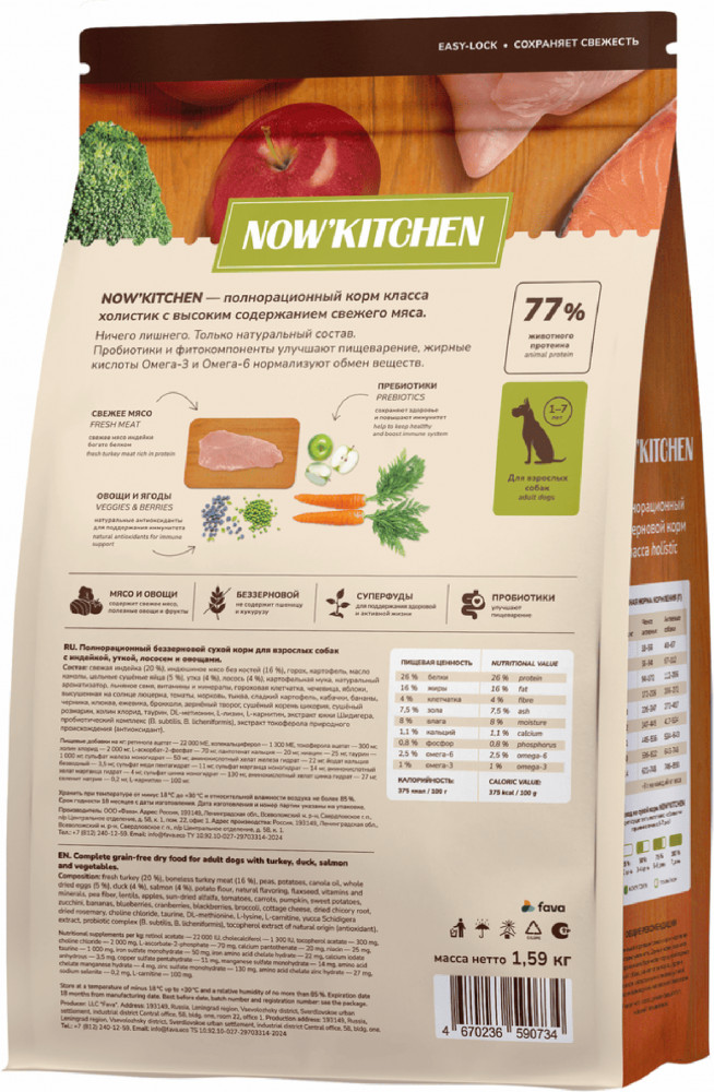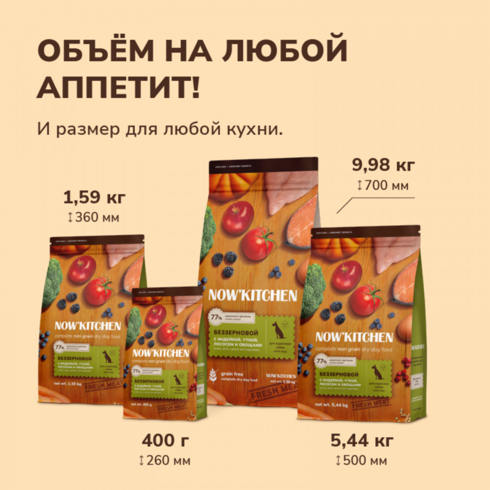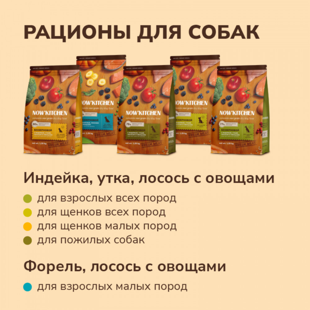 Now'Kitchen Корм беззерновой для взрослых собак с индейкой, уткой, лососем и овощами «Adult Grain-free Recipe, Turkey, Duck, Salmon»