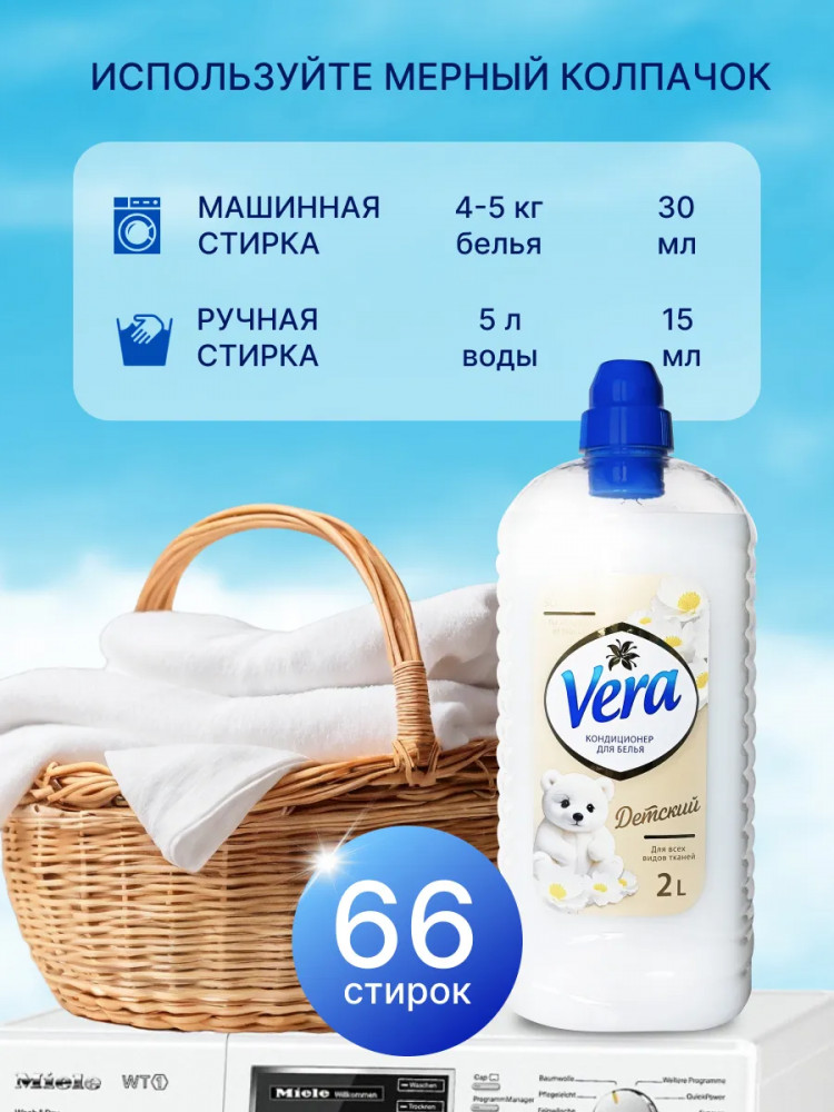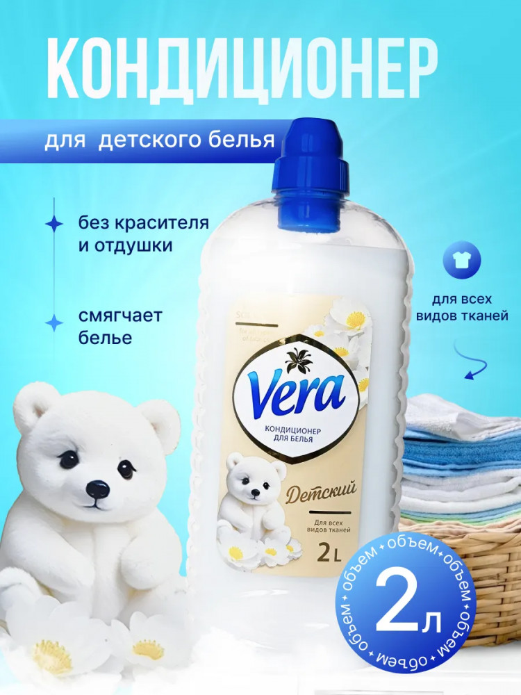 Кондиционер для белья Vera Детский предназначен для ополаскивания детских вещей и белья из всех видов тканей после стирки, а также вещей людей с чувствительной кожей. Независимо от того, стираете ли вы деликатные шелковые вещи или уютные хлопковые футболки, синтетику, шерсть наш кондиционер обеспечит идеальный уход за вещами. Он идеально подходит для стирки как белого и черного, так и цветного белья, сохраняя яркость красок и предотвращая появления катышков. Вы можете использовать его для стирки как в машине, так и вручную, не беспокоясь о повреждении волокон. Специально подобранная формула эффективно увлажняет волокна материала, делая их более мягкими на ощупь, что обеспечивает приятные ощущения при носке.