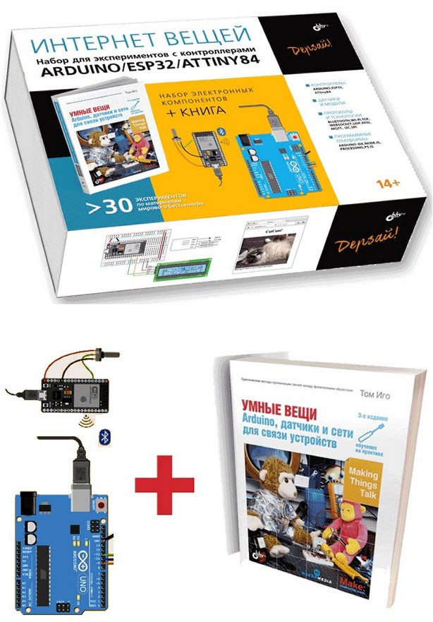 Интернет вещей. Комплект из книги и набора для экспериментов с контроллерами Arduino UNO/ESP32/ATtiny84В данный момент этот товар отсутствует в продаже. Возможно, у нас найдется аналогичный или похожий товар здесь. Серия: Дерзай! Наборы по электронике Набор подготовлен по материалам популярной книги Т. Иго «Умные вещи: Arduino, датчики и сети для связи устройств», которая в увлекательной форме вводит читателя в мир Интернета вещей. Выполнив 25 экспериментов, описанных в прилагаемом руководстве, вы научитесь осуществлять взаимодействие устройств с помощью контроллеров Arduino, ESP32 и ATtiny84 по каналам USB, Bluetooth, Wi-Fi и др. Создадите сетевой измеритель качества воздуха, осуществите инфракрасное управление цифровой камерой, сможете идентифицировать объекты с помощью Web-камеры и модулей RFID и др. |
