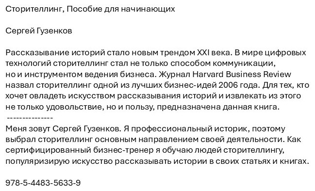 Сторителлинг. Пособие для начинающихВ данный момент этот товар отсутствует в продаже. Возможно, у нас найдется аналогичный или похожий товар здесь. Рассказывание историй стало новым трендом ХХІ века. В мире цифровых технологий сторителлинг стал не только способом коммуникации, но и инструментом ведения бизнеса. Журнал Harvard Business Review назвал сторителлинг одной из лучших бизнес-идей 2006 года. Для тех, кто хочет овладеть искусством рассказывания историй и извлекать из этого не только удовольствие, но и пользу, предназначена данная книга. Автор: Сергей Гузенков. |