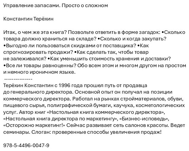 Управление запасами. Просто о сложномВ данный момент этот товар отсутствует в продаже. Возможно, у нас найдется аналогичный или похожий товар здесь. Книги по бухгалтерскому учету — это практические руководства, которые помогают разобраться в основах финансового учета, налогообложения и отчетности. Они предназначены как для начинающих бухгалтеров и предпринимателей, так и для опытных специалистов, желающих углубить свои знания. Читатели узнают о ключевых принципах ведения бухгалтерии, нормативных требованиях, методах оптимизации налоговой нагрузки и управленческого учета. Простые объяснения сложных тем, реальные примеры и пошаговые инструкции делают эти книги незаменимыми инструментами для успешного ведения бизнеса и принятия взвешенных финансовых решений. Автор: Константин Терёхин. |