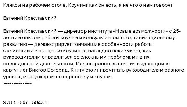 Кляксы на рабочем столе. Коучинг как он есть, а не что о нем говорятЕвгений Соломонович Креславский В данный момент этот товар отсутствует в продаже. Возможно, у нас найдется аналогичный или похожий товар здесь. Деловая литература — это жанр, охватывающий книги, направленные на развитие профессиональных навыков, личной эффективности и предпринимательского мышления. В таких книгах рассматриваются темы управления, лидерства, финансов, маркетинга, продаж, тайм-менеджмента и самореализации. Они помогают читателям лучше понимать законы бизнеса, осваивать стратегии успеха и применять их в реальной жизни. |