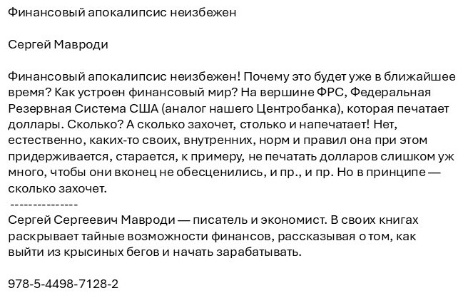 Финансовый апокалипсис неизбеженВ данный момент этот товар отсутствует в продаже. Возможно, у нас найдется аналогичный или похожий товар здесь. Деловая литература — это жанр, охватывающий книги, направленные на развитие профессиональных навыков, личной эффективности и предпринимательского мышления. В таких книгах рассматриваются темы управления, лидерства, финансов, маркетинга, продаж, тайм-менеджмента и самореализации. Они помогают читателям лучше понимать законы бизнеса, осваивать стратегии успеха и применять их в реальной жизни. Автор: Сергей Мавроди. |