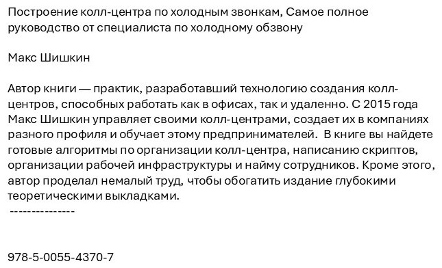 Построение колл-центра по холодным звонкам. Самое полное руководство от специалиста по холодному обзвонуВ данный момент этот товар отсутствует в продаже. Возможно, у нас найдется аналогичный или похожий товар здесь. Автор книги — практик, разработавший технологию создания колл-центров, способных работать как в офисах, так и удаленно. С 2015 года Макс Шишкин управляет своими колл-центрами, создает их в компаниях разного профиля и обучает этому предпринимателей. |