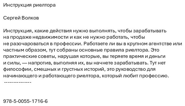 Инструкция риелтораВ данный момент этот товар отсутствует в продаже. Возможно, у нас найдется аналогичный или похожий товар здесь. Инструкция, какие действия нужно выполнять, чтобы зарабатывать на продаже недвижимости и как не нужно работать, чтобы не разочароваться в профессии. Работаете ли вы в крупном агентстве или частным образом, тут собраны основные правила риелтора. Это практические советы, нарушая которые, вы теряете время и деньги и силы, — напротив, выполняя их, вы начнете зарабатывать. Тут нет философии, смешных и грустных историй, это руководство для начинающего и работающего риелтора, который любит профессию. |