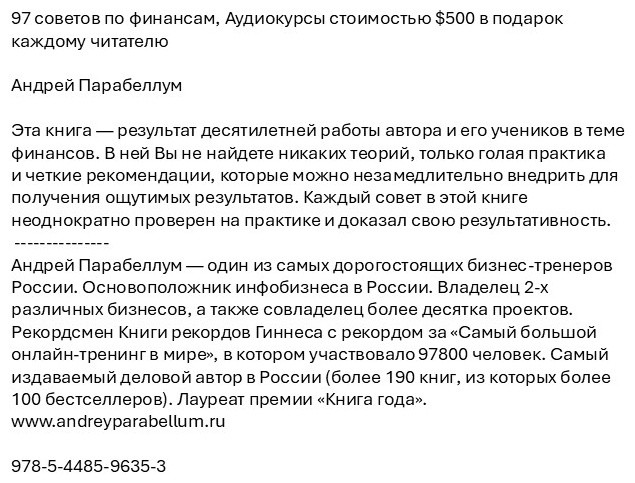 97 советов по финансамВ данный момент этот товар отсутствует в продаже. Возможно, у нас найдется аналогичный или похожий товар здесь. Бизнес-беллетристика — это жанр, в котором деловой опыт и практические уроки преподносятся через художественное повествование. Такие книги не ограничиваются сухими цифрами и теориями, они рассказывают истории реальных или вымышленных героев, отражающие жизненные вызовы, победы и поражения в мире бизнеса. Благодаря ярким персонажам, увлекательным сюжетам и глубоким психологическим портретам, бизнес-беллетристика помогает читателям не только получить полезные инсайты и стратегии, но и вдохновиться на новые свершения, увидеть бизнес с его человеческой стороны и понять, что за каждой успешной компанией стоят интересные судьбы и нелинейные пути развития. Автор: Андрей Парабеллум. |