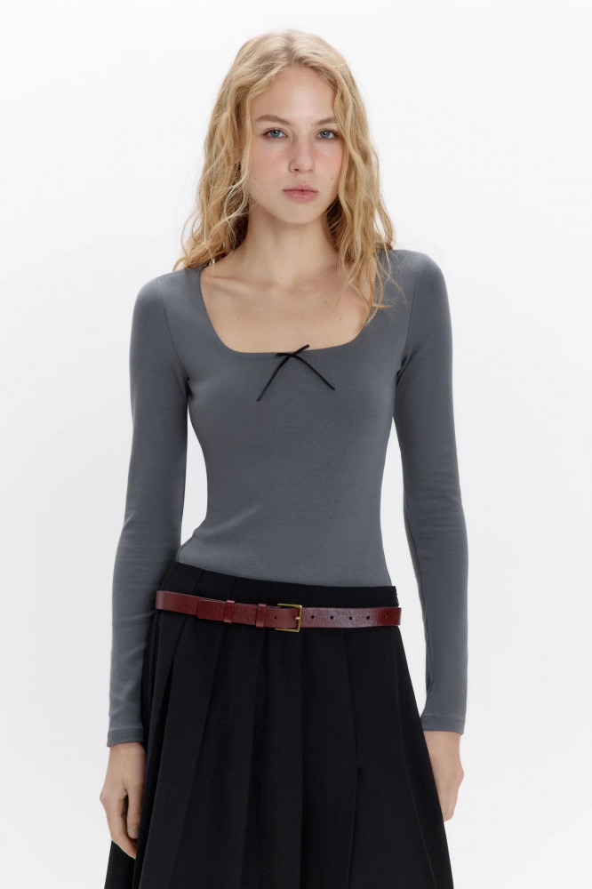 Женское боди-лонгслив облегающего кроя из мягкой, эластичной хлопковой ткани с гладкой трикотажной фактурой. Глубокий вырез-каре с декоративным бантиком на груди. Длинные облегающие рукава с прямыми манжетами и прямой линией плеча. Удобные широкие трусики-слипы с застежкой на кнопки снизу.