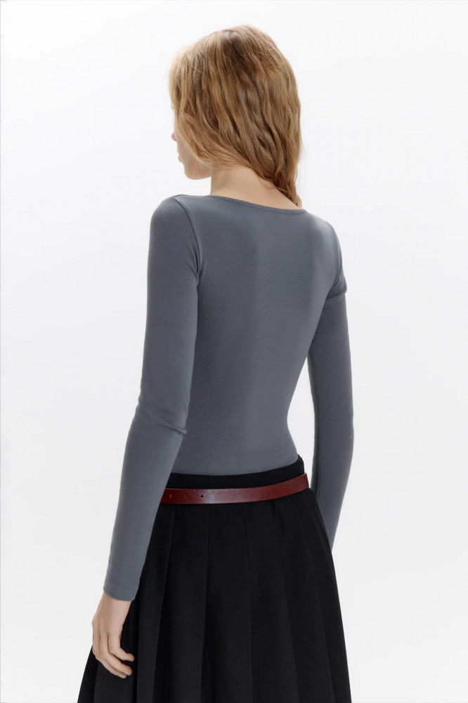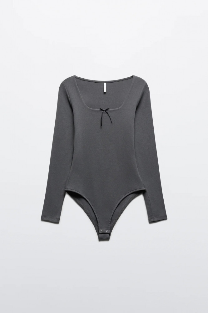 Женское боди-лонгслив облегающего кроя из мягкой, эластичной хлопковой ткани с гладкой трикотажной фактурой. Глубокий вырез-каре с декоративным бантиком на груди. Длинные облегающие рукава с прямыми манжетами и прямой линией плеча. Удобные широкие трусики-слипы с застежкой на кнопки снизу.