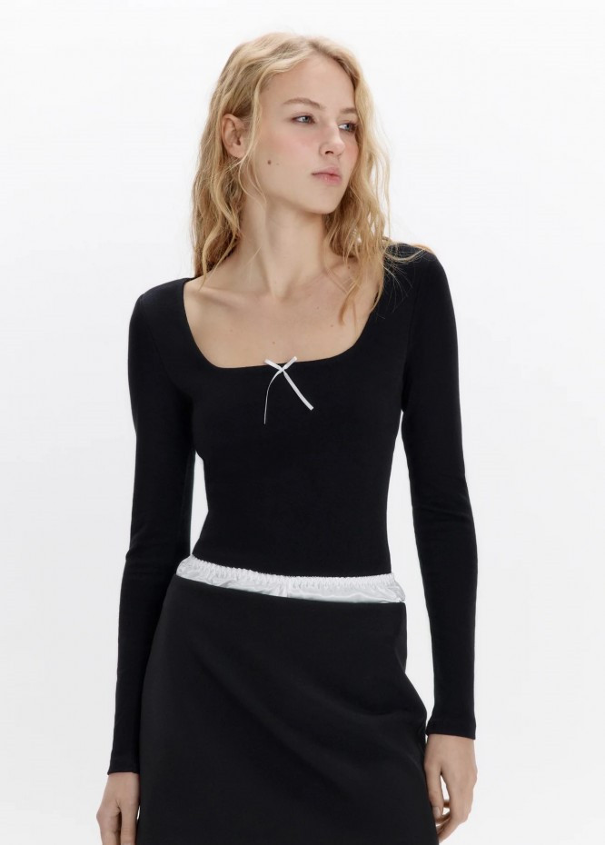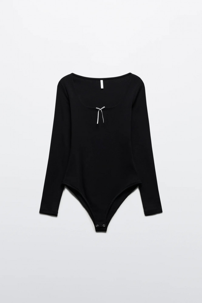 Женское боди-лонгслив облегающего кроя из мягкой, эластичной хлопковой ткани с гладкой трикотажной фактурой. Глубокий вырез-каре с декоративным бантиком на груди. Длинные облегающие рукава с прямыми манжетами и прямой линией плеча. Удобные широкие трусики-слипы с застежкой на кнопки снизу.