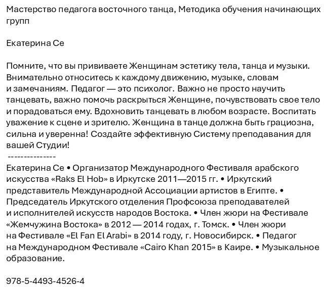 Мастерство педагога восточного танца. Методика обучения начинающих группВ данный момент этот товар отсутствует в продаже. Возможно, у нас найдется аналогичный или похожий товар здесь. Помните, что вы прививаете женщинам эстетику тела, танца и музыки. Внимательно относитесь к каждому движению, музыке, словам и замечаниям. Педагог — это психолог. Важно не просто научить танцевать, важно помочь раскрыться женщине, почувствовать свое тело и порадоваться ему. Вдохновить танцевать в любом возрасте. Воспитать уважение к сцене и зрителю. Женщина в танце должна быть грациозна, сильна и уверенна! Создайте эффективную Систему преподавания для вашей Студии! Автор: Екатерина Се. |