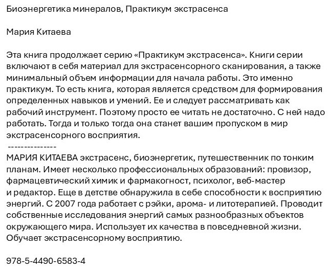 Биоэнергетика минералов. Практикум экстрасенсаВ данный момент этот товар отсутствует в продаже. Возможно, у нас найдется аналогичный или похожий товар здесь. Эта книга продолжает серию Практикум экстрасенса. Книги серии включают в себя материал для экстрасенсорного сканирования, а также минимальный объем информации для начала работы. Это именно практикум. То есть книга, которая является средством для формирования определенных навыков и умений. Ее и следует рассматривать как рабочий инструмент. Поэтому просто ее читать не достаточно. С ней надо работать. Тогда и только тогда она станет вашим пропуском в мир экстрасенсорного восприятия. Автор: Китаева М. |