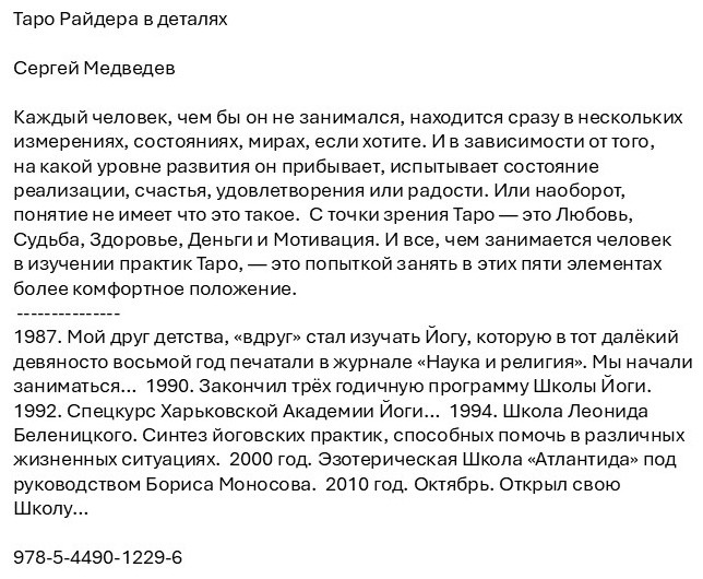 Таро Райдера в деталяхВ данный момент этот товар отсутствует в продаже. Возможно, у нас найдется аналогичный или похожий товар здесь. Книги о Таро — это проводник в мир мистики, интуиции и символики. Они помогают раскрыть тайны карт, понять их глубокие значения и научиться использовать колоды для гадания, самоанализа и духовного развития. Подходя как для новичков, так и для опытных практиков, литература по Таро открывает дверь в мир предсказаний, архетипов и глубоких озарений. Автор: Медведев С. |