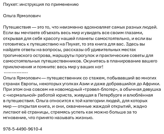 Пхукет: инструкция по применениюВ данный момент этот товар отсутствует в продаже. Возможно, у нас найдется аналогичный или похожий товар здесь. Книги о туризме — это увлекательные путеводители по миру, открывающие перед читателями разнообразные маршруты, уникальные природные уголки, культурные достопримечательности и традиции разных народов. Они помогают спланировать путешествие, рассказывают о лучших местах для отдыха, делятся советами по безопасности, бюджетному туризму и особенностям местной кухни. Автор: Ярмолович О. |