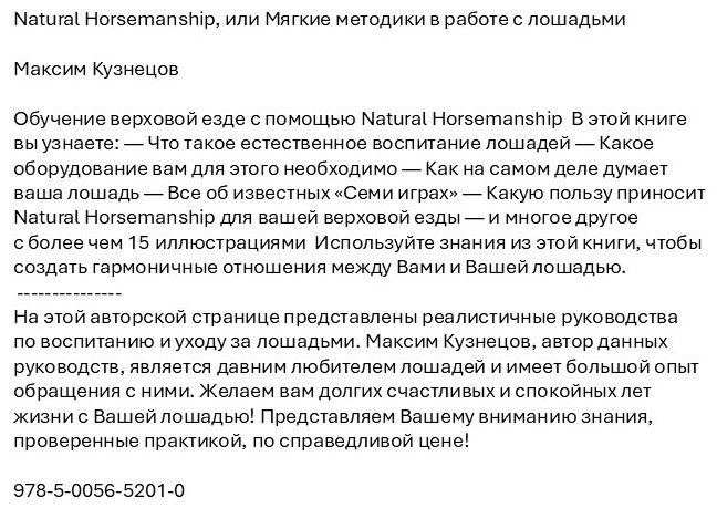 Natural Horsemanship, или Мягкие методики в работе с лошадьмиВ данный момент этот товар отсутствует в продаже. Возможно, у нас найдется аналогичный или похожий товар здесь. Книги по воспитанию домашних животных помогают владельцам понять поведение своих питомцев, обучить их полезным командам и создать комфортные условия для жизни. Эти книги подходят как для начинающих, так и для опытных владельцев, желающих лучше понять своих животных и сделать их жизнь счастливее. В книге рассматриваются основные принципы дрессировки, психологические особенности различных видов животных, советы по уходу, а также методы коррекции нежелательного поведения. Автор: Кузнецов М. |