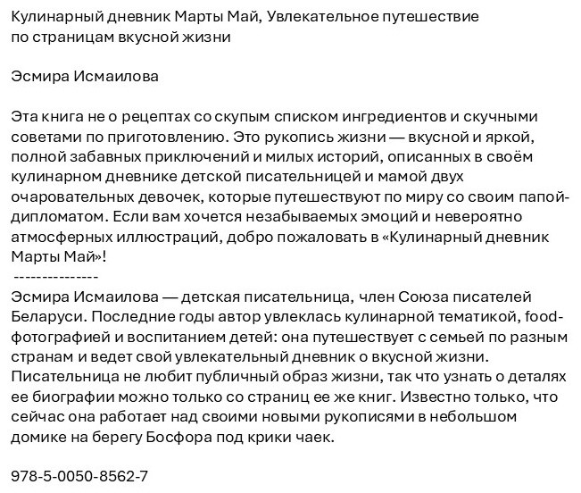 Кулинарный дневник Марты Май. Увлекательное путешествие по страницам вкусной жизниВ данный момент этот товар отсутствует в продаже. Возможно, у нас найдется аналогичный или похожий товар здесь. Эта книга не о рецептах со скупым списком ингредиентов и скучными советами по приготовлению. Это рукопись жизни — вкусной и яркой, полной забавных приключений и милых историй, описанных в своём кулинарном дневнике детской писательницей и мамой двух очаровательных девочек, которые путешествуют по миру со своим папой-дипломатом. Если вам хочется незабываемых эмоций и невероятно атмосферных иллюстраций, добро пожаловать в Кулинарный дневник Марты Май! Автор: Исмаилова Э. |
