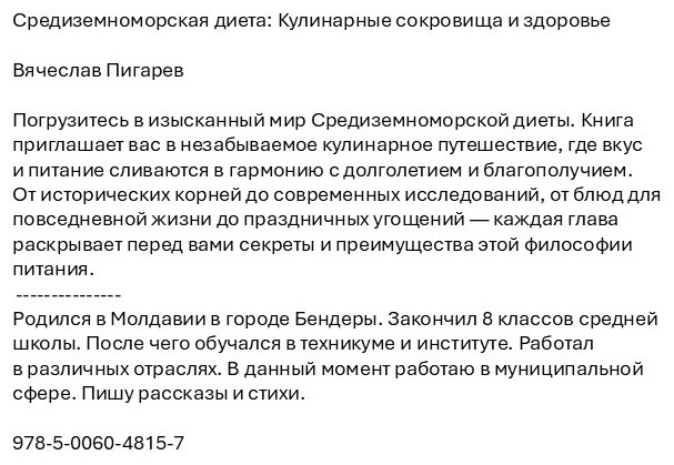 Средиземноморская диета. Кулинарные сокровища и здоровьеВ данный момент этот товар отсутствует в продаже. Возможно, у нас найдется аналогичный или похожий товар здесь. Погрузитесь в изысканный мир Средиземноморской диеты. Книга приглашает вас в незабываемое кулинарное путешествие, где вкус и питание сливаются в гармонию с долголетием и благополучием. От исторических корней до современных исследований, от блюд для повседневной жизни до праздничных угощений — каждая глава раскрывает перед вами секреты и преимущества этой философии питания. Автор: Пигарев В. |