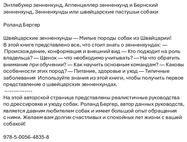 Энтлебухер зенненхунд. Аппенцеллер зенненхунд и Бернский зенненхунд, Зенненхунды или швейцарские пастушьи собакиВ данный момент этот товар отсутствует в продаже. Возможно, у нас найдется аналогичный или похожий товар здесь. Книги по воспитанию домашних животных помогают владельцам понять поведение своих питомцев, обучить их полезным командам и создать комфортные условия для жизни. Эти книги подходят как для начинающих, так и для опытных владельцев, желающих лучше понять своих животных и сделать их жизнь счастливее. В книге рассматриваются основные принципы дрессировки, психологические особенности различных видов животных, советы по уходу, а также методы коррекции нежелательного поведения. Автор: Бергер Р. |