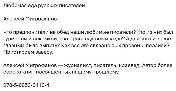 Любимая еда русских писателейВ данный момент этот товар отсутствует в продаже. Возможно, у нас найдется аналогичный или похожий товар здесь. Что предпочитали на обед наши любимые писатели? Кто из них был гурманом и лакомкой, а кто равнодушным к еде? А для кого и вовсе главным было выпить? Как все это связано с их прозой и поэзией? Приоткроем завесу. Автор: Митрофанов А. |