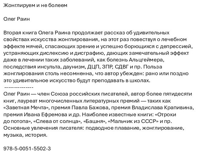 Жонглируем и не болеемВ данный момент этот товар отсутствует в продаже. Возможно, у нас найдется аналогичный или похожий товар здесь. Книга Олега Раина продолжает рассказ об удивительных свойствах искусства жонглирования, на этот раз повествуя о лечебном эффекте мячей, спасающих зрение и успешно борющихся с депрессией, устраняющих дислексию и дисграфию, дающих замечательный эффект даже в лечении таких заболеваний, как болезнь Альцгеймера, последствия инсульта, даунизм, ДЦП, ЗПР, СДВГ и пр. Польза жонглирования столь несомненна, что автор убежден: рано или поздно это удивительное искусство будут преподавать в школах. Автор: Раин О. |