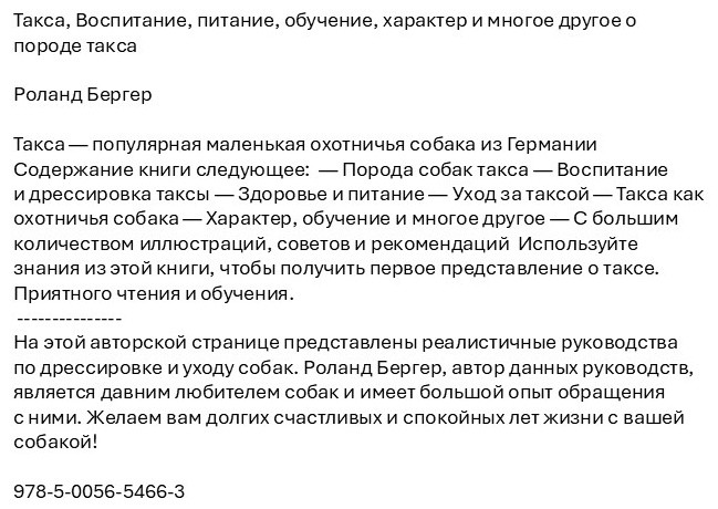 Такса. Воспитание, питание, обучение, характер и многое другое о породе таксаВ данный момент этот товар отсутствует в продаже. Возможно, у нас найдется аналогичный или похожий товар здесь. Книги по воспитанию домашних животных помогают владельцам понять поведение своих питомцев, обучить их полезным командам и создать комфортные условия для жизни. Эти книги подходят как для начинающих, так и для опытных владельцев, желающих лучше понять своих животных и сделать их жизнь счастливее. В книге рассматриваются основные принципы дрессировки, психологические особенности различных видов животных, советы по уходу, а также методы коррекции нежелательного поведения. Автор: Бергер Р. |