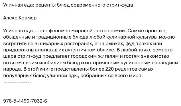 Уличная еда: рецепты блюд современного стрит-фудаВ данный момент этот товар отсутствует в продаже. Возможно, у нас найдется аналогичный или похожий товар здесь. Уличная еда — это феномен мировой гастрономии. Самые простые, обыденные и традиционные блюда любой кулинарной культуры можно встретить не в шикарных ресторанах, а на рынках, фуд-траках или придорожных лотках в их аутентичном облике. В любой точке земного шара стрит-фуд предлагает городским жителям и гостям знакомство со всем своим изобилием блюд и историческим кулинарным наследием народа. В этой книге представлены более 220 рецептов самых популярных блюд уличной еды, собранных со всего мира. Автор: Крамер А. |